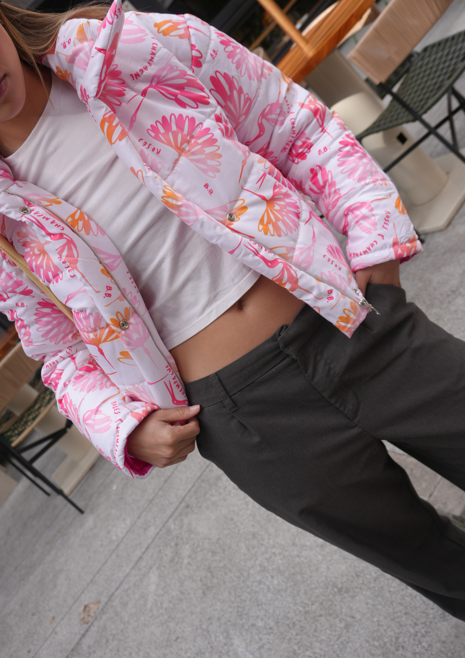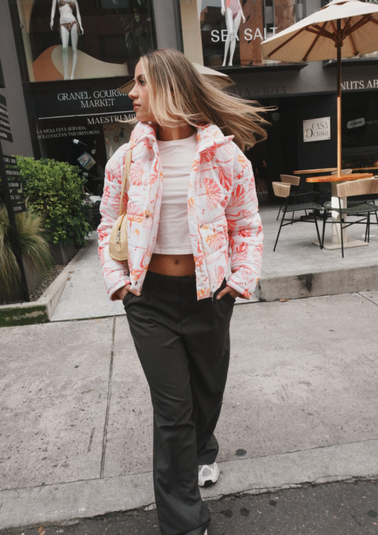 - Chaqueta marfil acolchada estampada inspirada en el art deco de los años 20’s
